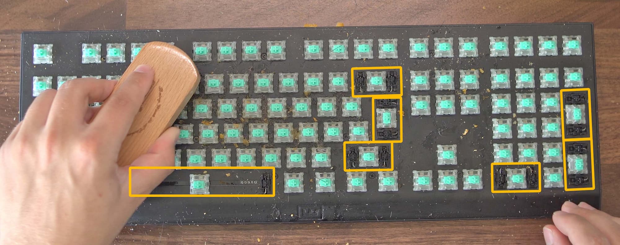 The easiest way to remove the biggest debris and crumbles is to grab a brush and brush it all away. Make sure to avoid the gaps at your stabilizers, as you don’t want any filth getting in between your top plate and PCB. We marked the spots to avoid in yellow in the image below.
