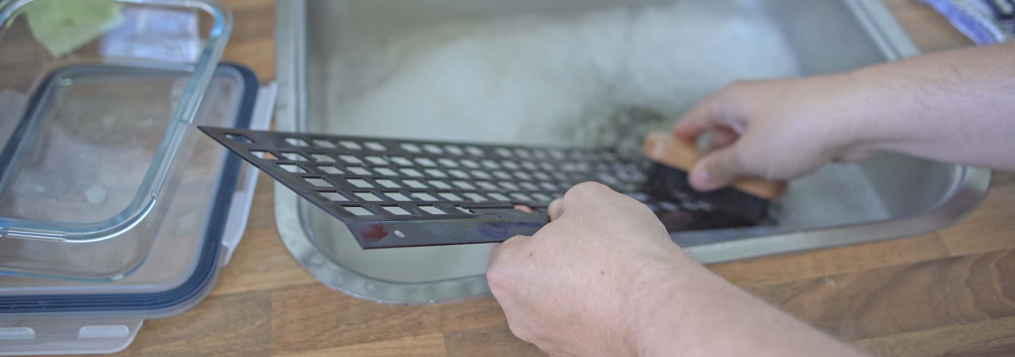 Fill up your sink with lukewarm water and put some dishwasher detergent inside. Insert the top plate in the sink and scrub all over it with the soft brush. Do this continuously until you don’t see any debris stuck on the plate anymore. Grab a towel to dry the top plate off.