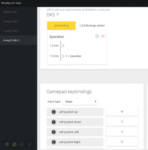 The great thing is that you're not forced to use analog, you can also only use DKS and digital keys in the analog profile. Unbind all the Xinput/DirectInput keys, or more extreme, turn off Xinput (in the general settings).The new Wootility is in public release now.