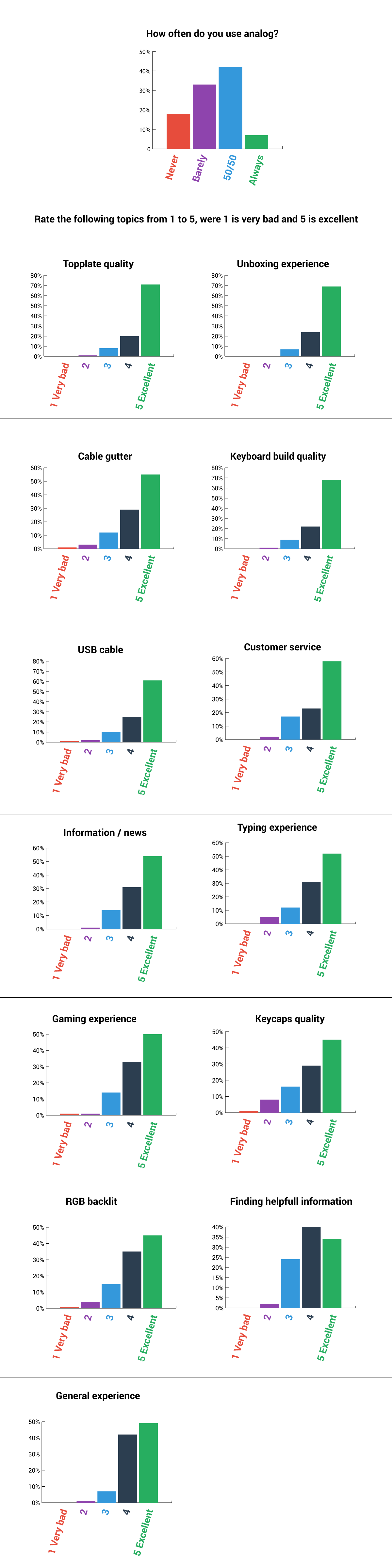 We ran a survey November 2017 asking for feedback from people that had used the Wooting one for a couple of months already.I want to thank everybody once again for participating and sharing this information. It has given us a lot of insight and removed some of the biased/tunnel vision we had created. We had already started working on all the possible improvements, and hope you had noticed.The survey consists out of quantitive feedback and qualitative feedback. I'll go through each question, generalize and sometimes add a note.